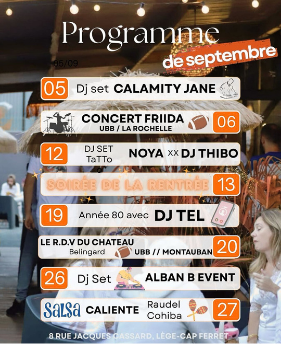 Notez les rendez-vous à ne pas manquer : DJ Calamity Jane, concert Frida, soirée de la rentrée, salsa caliente et bien d’autres surprises !
